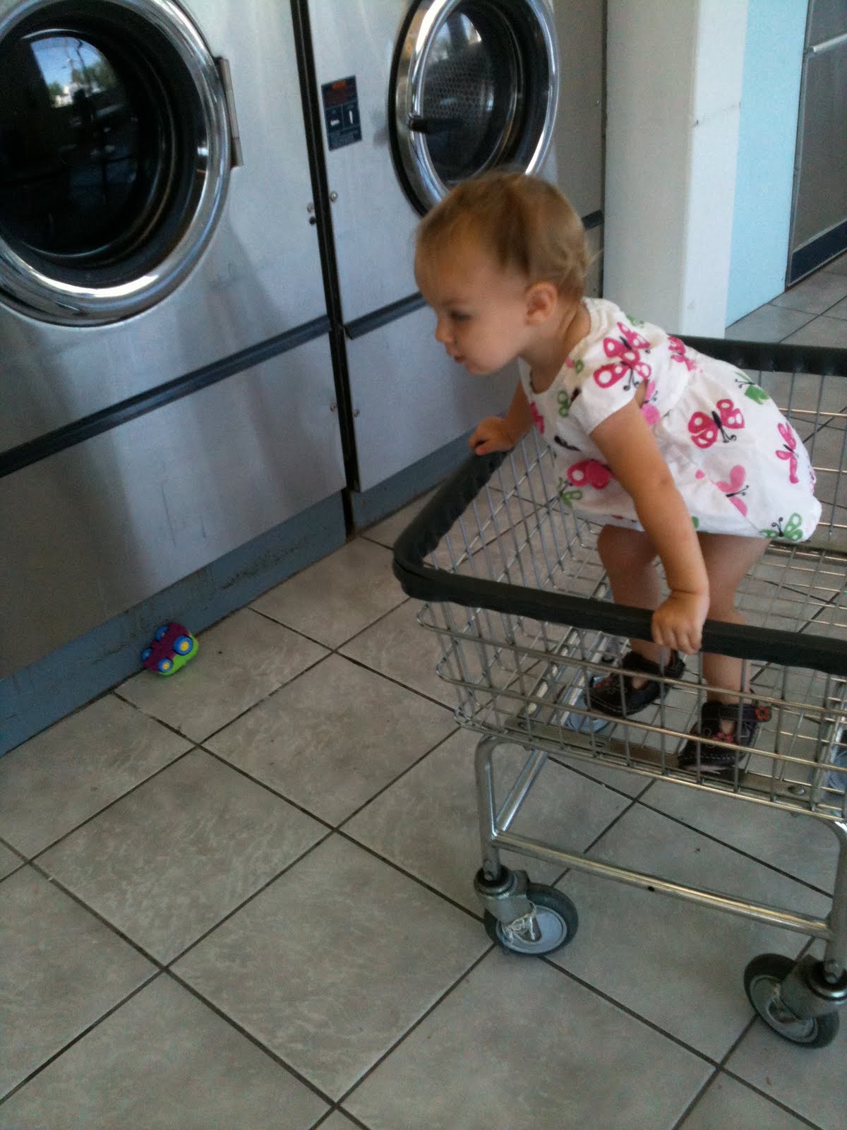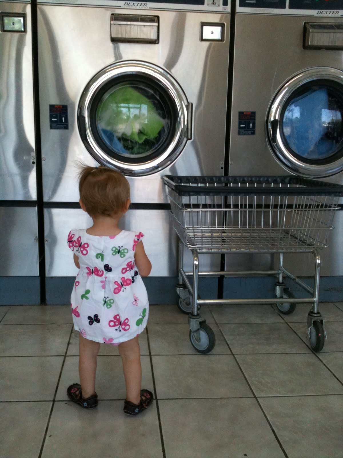 I split my twenty plus mats into two oversize washers, put my bills into the machine to make change and then Finley and I set the washing . Finley stood in front of the washers completely mesmerized by the water filling the washer. She pointed and babbled to herself and me as the wash began spinning. Who knew such an ordinary thing as washing would be such a great entertainment for a 13 month old! I just love how ordinary things like doing the laundry becomes an adventure when I see it through Fin’s eyes.