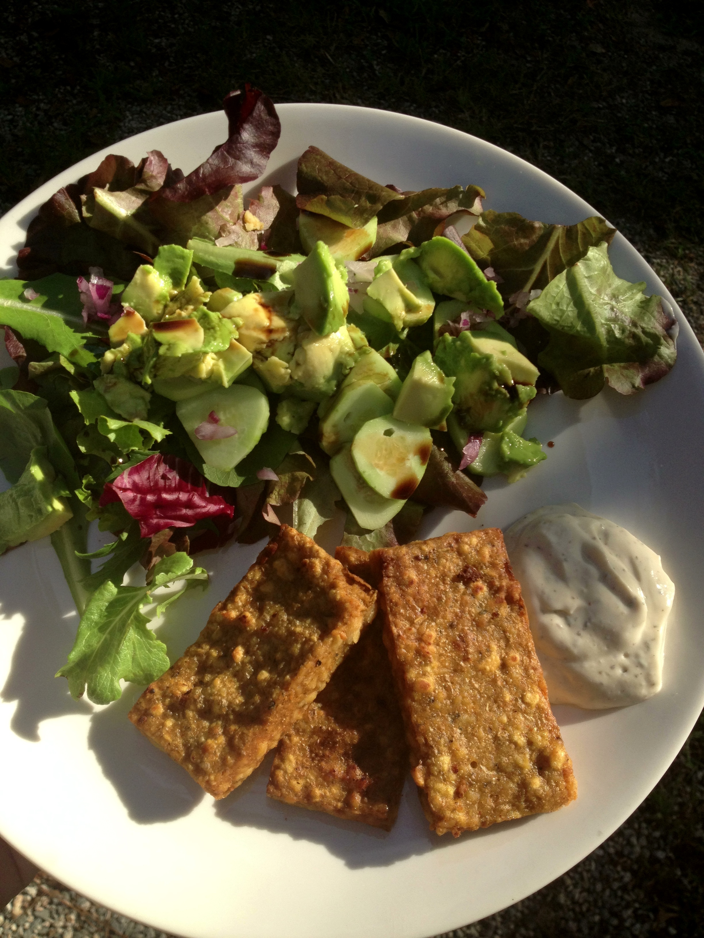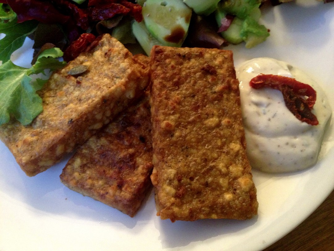 Slice the pan of set chickpeas into fingers. Heat a pan with a little bit of oil that can take high heat like peanut or coconut oil and fry each side of fingers until golden. Lay them out on a paper towel to cool and absorb any excess oil & serve with a salad and a dipping sauce. It goes nicely with a ranch flavoured dressing for dipping or a cucumber based dressing like tzatziki.