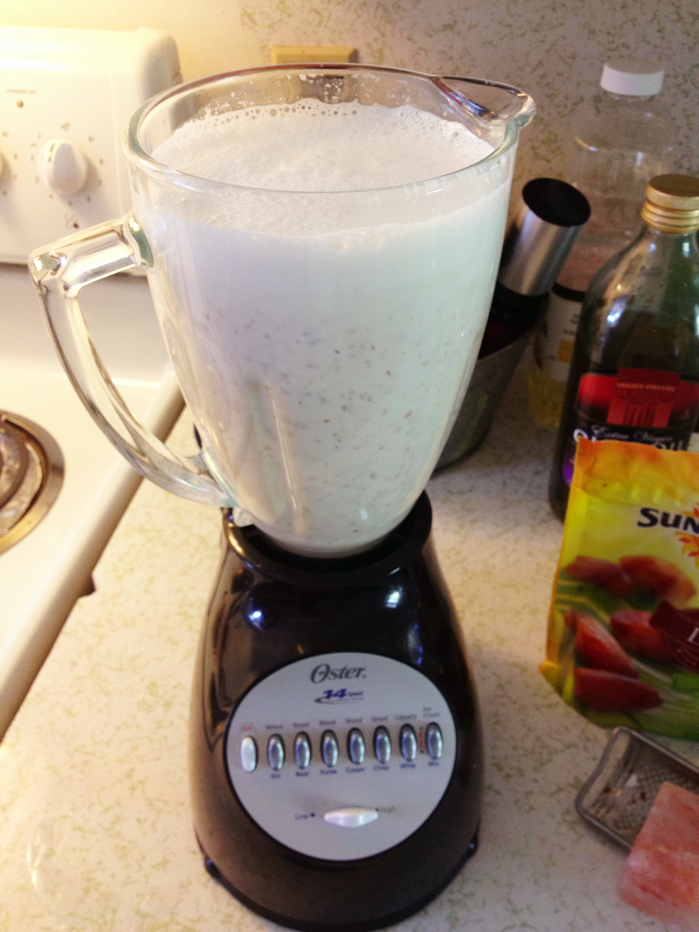 As you can see below there is quite a bit of almond pith in the blender.  If you have a high end blender, which I don’t … (YET!)  you might reduce the amount of pith a bit.  Still, you will have to separate the milk from the pith.